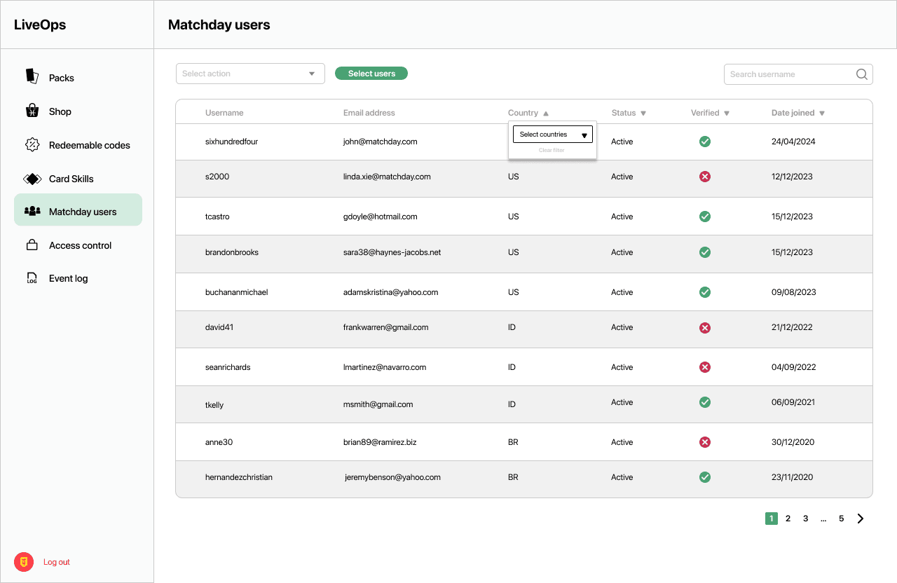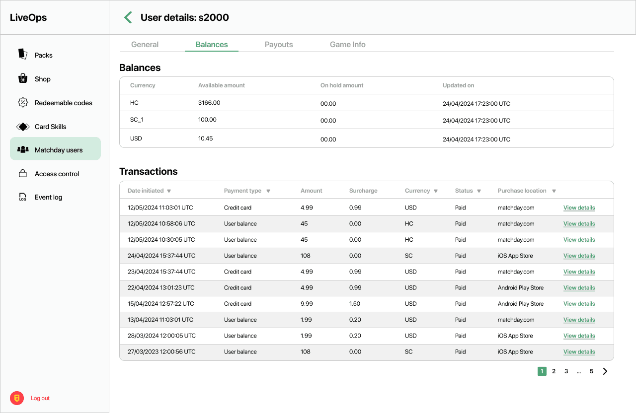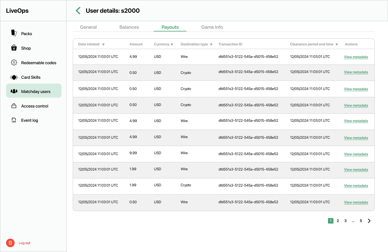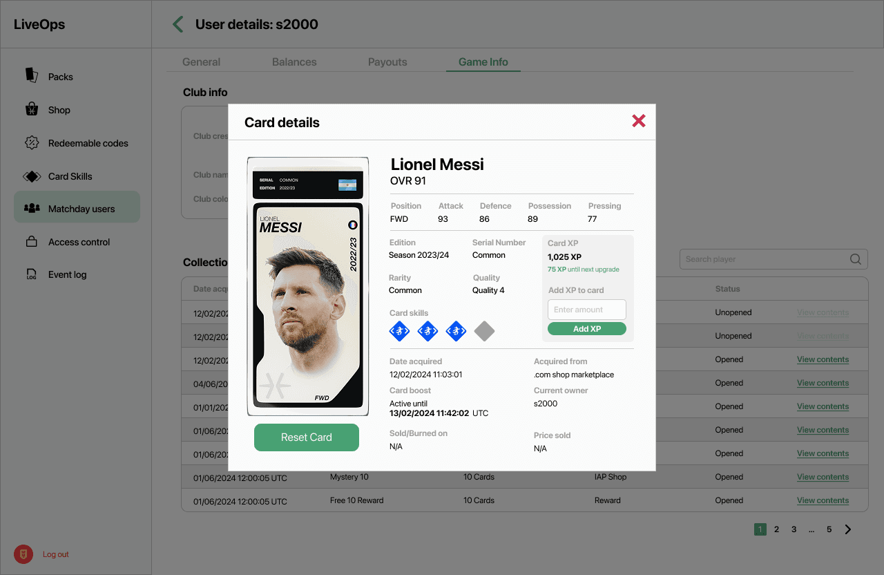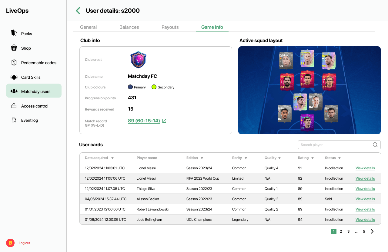 As part of the Internal Admin Tool, I designed a comprehensive User Management experience that empowers internal teams to monitor, audit, and act on player activity with clarity and precision. The system gives admins the ability to flag suspicious or fraudulent accounts, ban users when necessary, and view detailed user histories at a glance. This includes full transaction logs, gameplay data, and a visual record of every footballer card a user has earned or purchased — whether through rewards or the marketplace. The design focuses on surfacing the most important information quickly while keeping interactions intuitive, so teams can act fast without getting lost in complexity. It’s all about combining power with usability to help protect the integrity of the game.