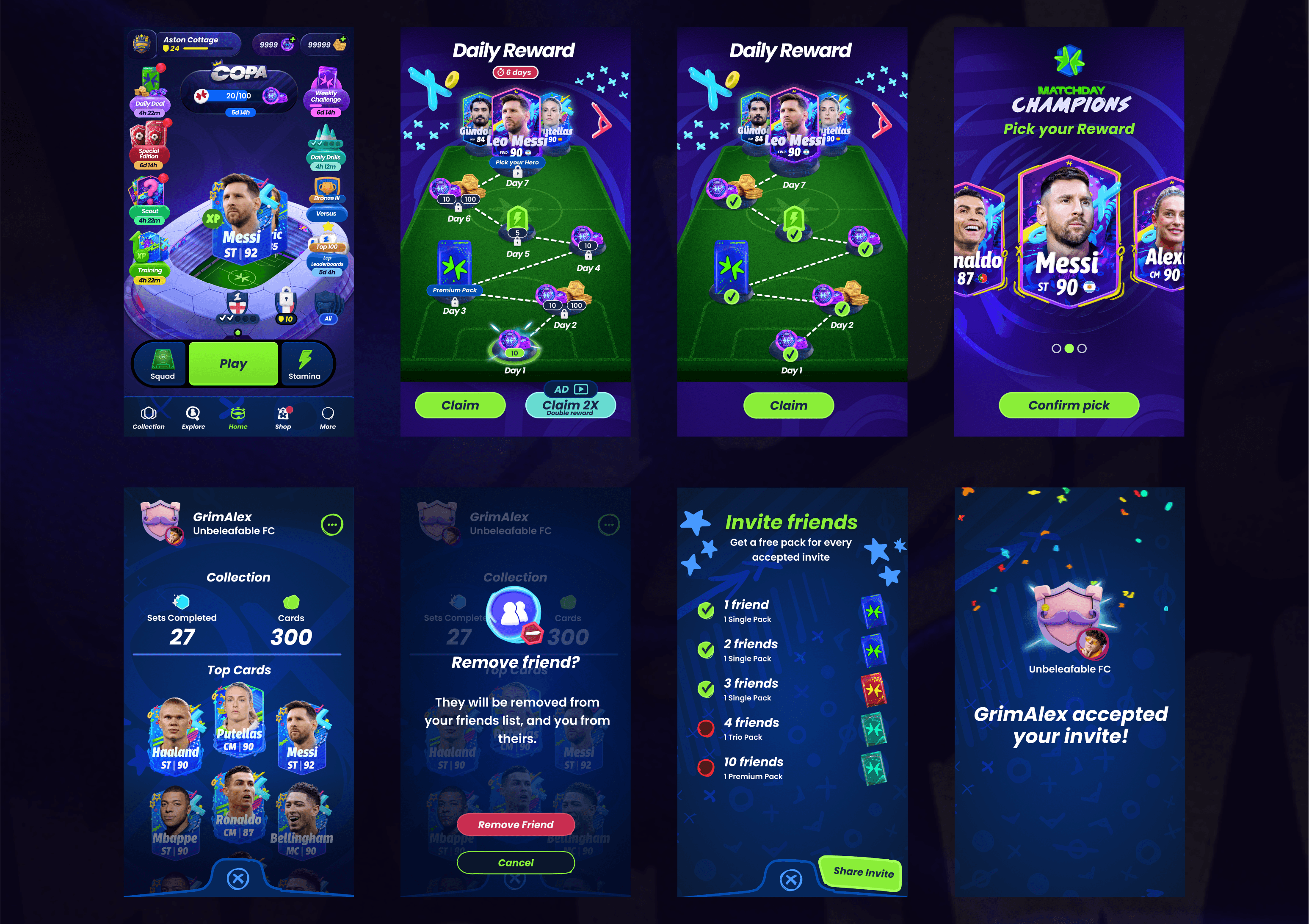 As a Product Designer on the Platform team at Matchday, I worked across web, mobile, and internal tools to support both the core platform (matchday.com) and the casual football mobile game Matchday Champions. My role involved designing user-facing features, ensuring UX/UI consistency between the website and the game, and improving internal tools for content creation and player rewards. I contributed to both the admin tool’s UI/UX—used by teams to manage live content and player engagement—and to the Game Studio team, where I designed features like Daily Rewards, Invite Friends, and collectible player cards. My work also included 3D modeling and card design, ensuring a cohesive visual and interactive experience across platforms.